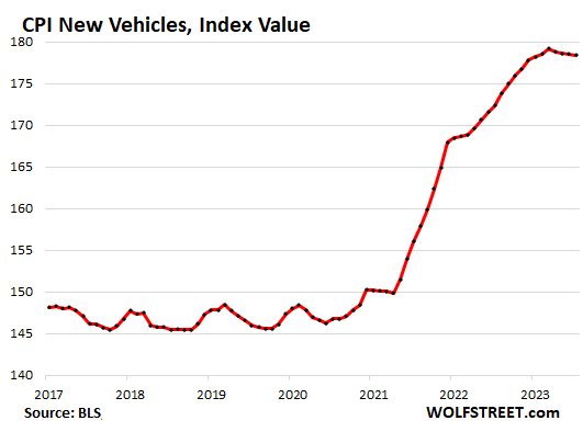 New vehicle CPI dipped by 0.1% for the month, the fourth month in a row of slight month-to-month dips, amid big price cuts by Tesla and other EV makers. But year-over-year, the index was still up 3.5%.