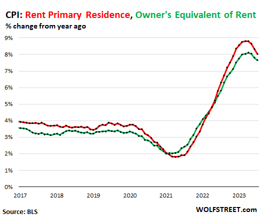 “Rent of primary residence”: +0.41% for July, +8.0% year-over-year (red in the chart below). The July rate of 0.41% amounts to annualized growth rate of 5.0%.