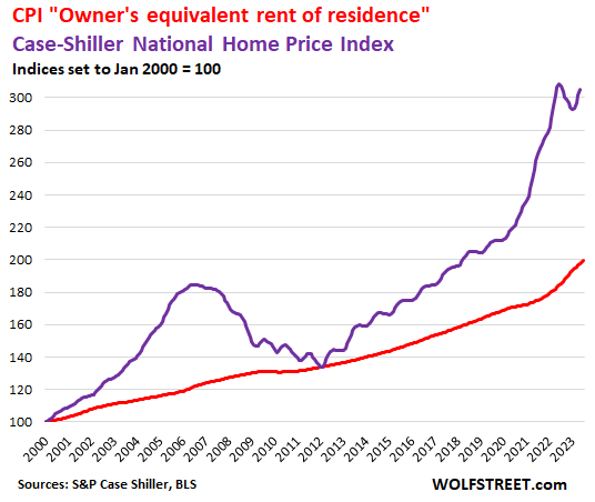 Rent inflation vs. home-price inflation: The red line represents the OER. The purple line represents the Case-Shiller Home Price Index. Both lines are index values set to 100 for January 2000: