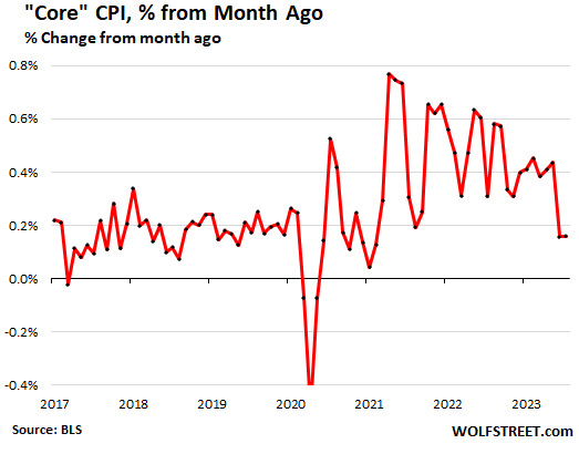 The “Core” CPI rose by a still hot 4.7% in July, compared to a year ago, an increase that was a hair smaller than in June (+4.8%), according to data by the Bureau of Labor Statistics today. July was the smallest increase since October 2021. Core CPI is a measure of underlying inflation that excludes the prices of food and energy products, which gyrate wildly in both directions.