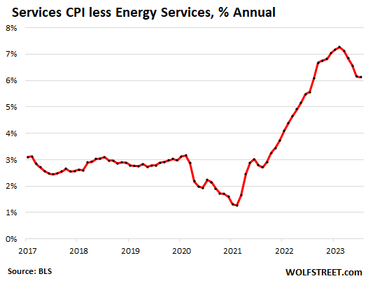 Year-over-year, the core services CPI rose by a still red-hot 6.1%, compared to 6.2% in July. Unrounded, the difference was minuscule, as the chart shows, 6.124% v. 6.159%.