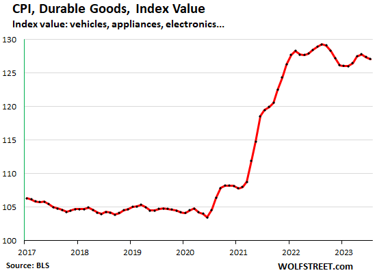 The CPI for durable goods – the index value, not percent-change – has moved up and down at nosebleed levels, with a slight downward trend, since early 2022, following the spike from mid-2020 into early 2022.