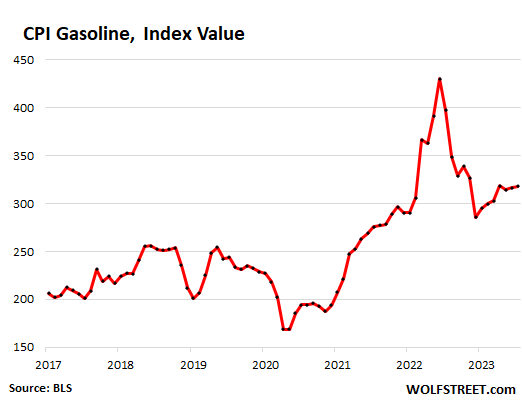 Gasoline accounts for about half of the total energy CPI. It has been rising for seven months, and over the next few months will turn positive on a year-over-year basis, measured against the plunging prices in the second half of 2022. This will further push up overall CPI. You can see this dynamic in the CPI for gasoline as index value; the low-point was December: