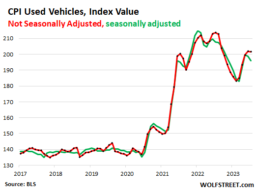 Used vehicles CPI fell by 1.3% for the month, seasonally adjusted (green), and by 5.2% year-over-year, following the 52% spike from mid-2020 through mid-2022. Not seasonally adjusted (red), it edged down 0.2% in July from June.