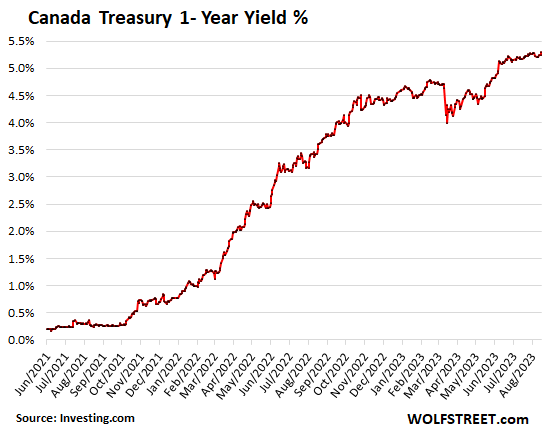 Short-term yields spiked from the pause-low in March of 4.0% to 5.3% today, mortgage rates with them: First results of the Bank of Canada’s unpause.