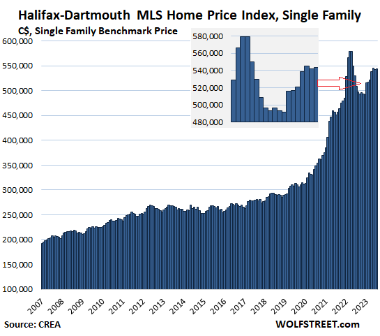 Halifax-Dartmouth: The single-family benchmark price inched up by 0.2%, after having dropped by 0.5% in the prior month, to $543,500: