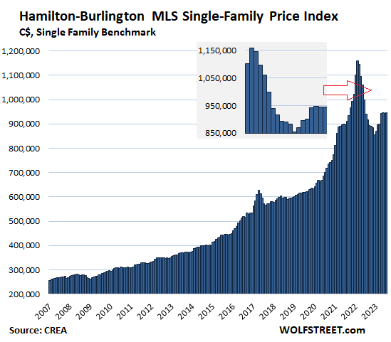 Hamilton-Burlington metro: The single-family benchmark price inched up 0.1% for the month, to $943,300. Note in the insert that the price has been essentially flat for the fourth month in a row: