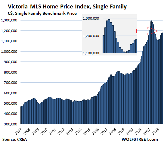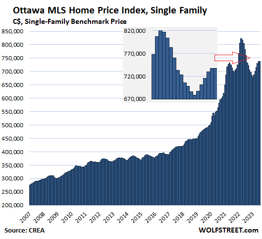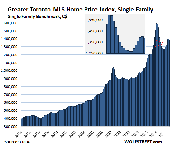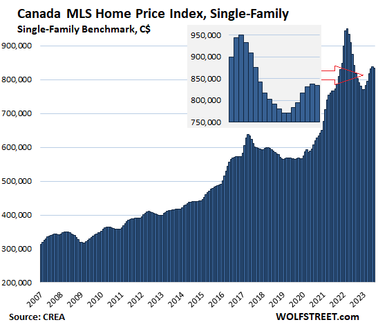 The spring selling season, or rather the Bank of Canada “Pause” season, which had been a rocking and rolling hoot, is over, and the first price declines are here. The Canada Home Price Benchmark Index for single family houses fell by 0.5% in July from June, and by 0.9% year-over-year, to $834,500 (all prices in Canadian dollars), the first decline since January, according to data from the Canadian Real Estate Association (CREA) today.