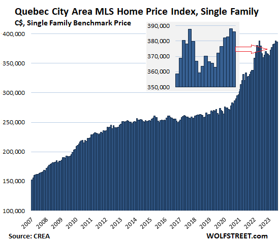 Quebec City Area: The single-family benchmark price dropped 0.5% from the record in June, to $386,200, and was up by 5.3% year-over-year: