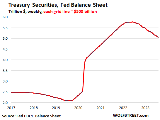 5. While the Fed is unloading Treasuries. So far, the Fed has reduced its holdings of Treasury securities by $723 billion from the peak in June 2022. It reduces its holdings by not replacing maturing securities. At $5.05 trillion, its holdings are now the lowest since May 2021. It has shed 22.3% of the Treasury securities it had bought under its pandemic QE ($3.25 trillion).