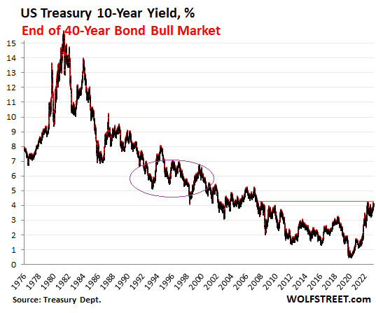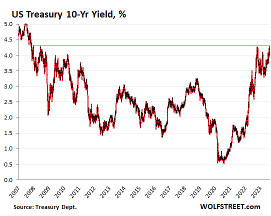 The 10-year yield closed at 4.28% today, according to Treasury Department data, the highest since, well, let’s look here, November 14, 2007, so about 15 years ago, having edged past November 2022 and June 2008 by a hair. 2007 is notable in that it was the last year before the arrival of QE.