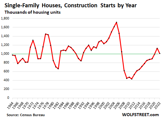 Multifamily starts have been at a four-decade high, a huge boom. Single-family starts were up by more than 100% from the 2008-2013 years, and were right back where they had been before the 2005 housing bubble before it collapsed because of overbuilding of SFH. And at the time (1990 – 2005), household growth and population growth far outpaced today’s rates.