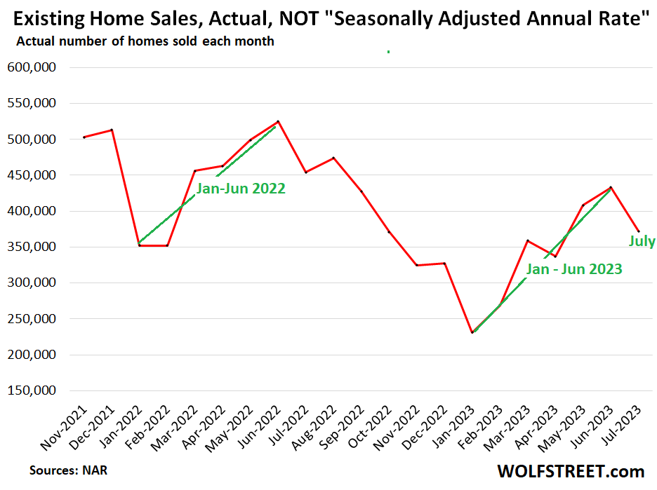 Actual sales in July – not seasonally adjusted annual rate – fell 18.1% year-over-year to 372,000 homes. The seasonal patterns are clear, the “spring selling season,” marked in green is over (data via NAR):