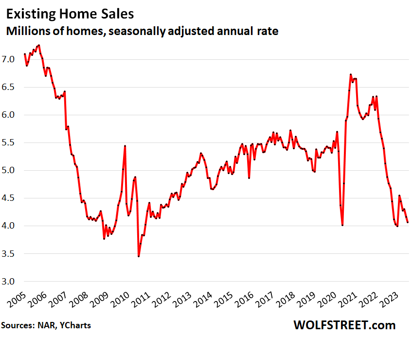 Sales of previously owned homes (houses, condos, and co-ops) fell further, by 2.2% in July from June, to a deep-dismal seasonally adjusted annual rate of sales of 4.07 million, the lowest since January, which had matched the March 2020 lockdown low, which had been the lowest since the Housing Bust in 2010, even as the median price fell, as days on the market rose, and as supply rose to match the highs in 2022, and beyond that to the most supply since June 2020, according to the National Association of Realtors today.