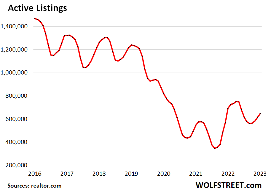 The all-time low was February 2022 at 346,161 active listings.
