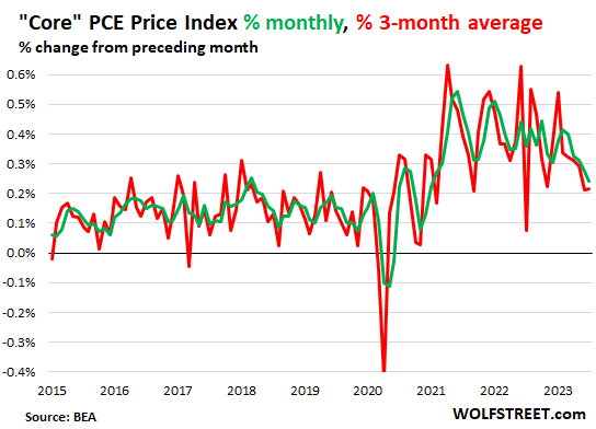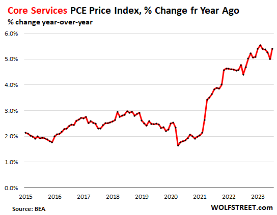 In core services is where inflation has gotten entrenched. Durable goods prices fell on falling prices of motor vehicles, electronics, home furnishings, etc. But inflation in services is where it’s at, and where it is very hard and frustrating to eradicate from.