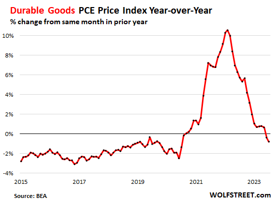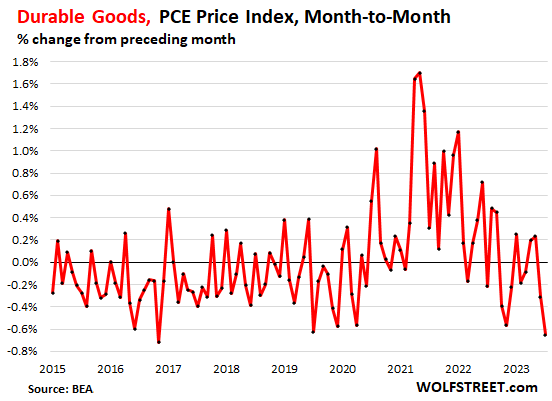 But the durable goods PCE price index plunged by 0.65% in July from June, the steepest drop since 2017, after having declined by 0.31% in June, with all four major categories declining, as some of the ridiculous price spikes, particularly for motor vehicles, have been partially unwinding since mid-2022.