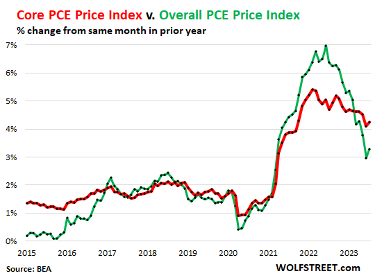 The overall PCE price index accelerated to 3.3% year-over-year, pulled down by the 22% year-over-year plunge in energy prices (now abating), which caused the overall PCE price index (green) to remain below the core PCE price index (red) for the fifth month in a row. And both are going in the wrong direction.