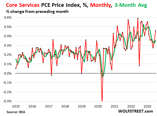 Month-to-month, the “core” services PCE price index – services minus energy services – jumped by 0.46% in July from June (5.7% annualized), the second month in a row of acceleration, according to the BEA today (red line in the chart below). The three-month moving average (green line) accelerated to 0.36%.