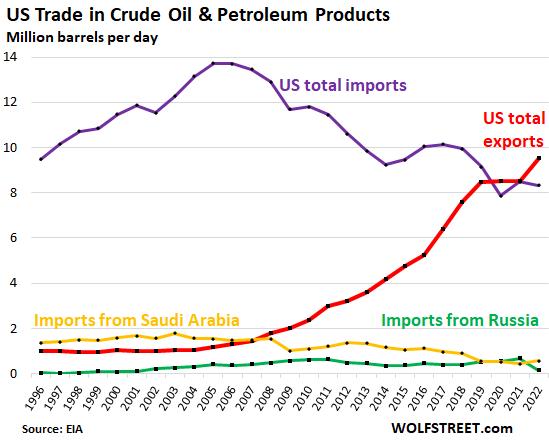 The chart shows imports of crude oil and petroleum products (purple) and exports of crude oil and petroleum products (red). It also shows the portion of imports that come from Russia (green) and Saudi Arabia (yellow):