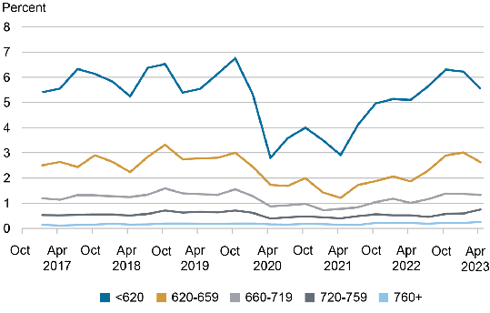 “massive increase recently in credit card and esp. auto loan delinquencies.” OK, here we go, credit card delinquencies by credit score, New York Fed: