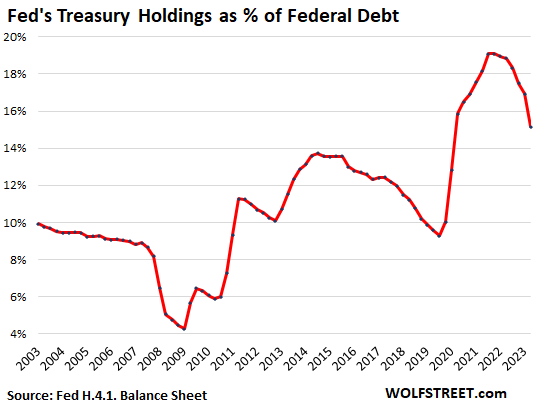 The Fed’s weight in the Treasury market dropped as its holdings of Treasury securities dropped to $4.99 trillion while the government’s debt ballooned to $32.9 trillion amid the tsunami of new issuance of Treasury securities to fund its deficit spending. This reduced the Fed’s holdings to 15.2% of total Treasury securities outstanding.