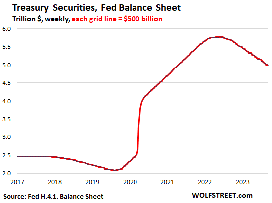Treasury securities: -$59.5 billion in August, -$783 billion from peak in June 2022, to $4.99 trillion, the lowest since April 2021.