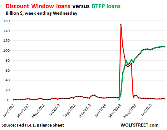 Discount Window lending to banks has been around for a long time. This is not free money, it’s expensive money: since the last rate hike, the Fed charges banks 5.50%. In addition, banks have to post collateral under strict limits and at “fair market value.” So banks pay off these Discount Window loans as soon as they can.
