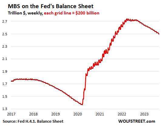 Mortgage-Backed Securities: -$19 billion in August, -$241 billion from the peak, to $2.50 trillion, the lowest since October 2021.