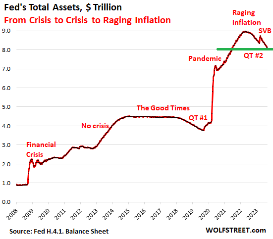 From crisis to crisis to raging inflation: Note the cute little QT #1 between November 2017 and August 2019, when total assets dropped by $688 billion. QT #2, which started ramping up in the summer of 2022, has already reached $864 billion, but the Fed’s pile has gotten a lot bigger and there’s a lot more to take off the pile.