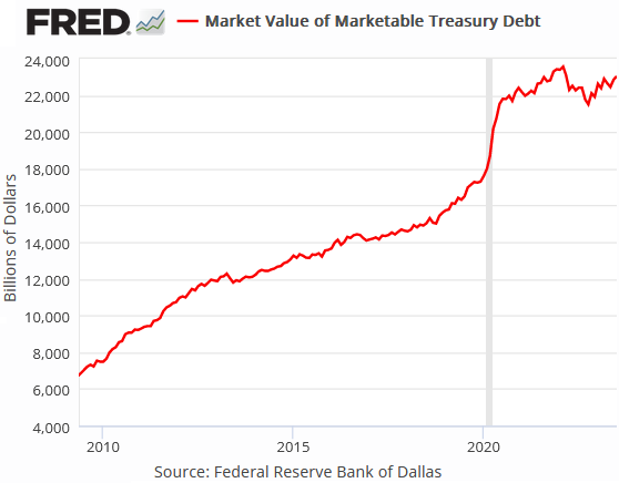 Here is the chart you pointed out (MVMTD027MNFRBDAL at the St. Louis Fed data collection), showing the market value of US Treasury securities that are publicly traded: