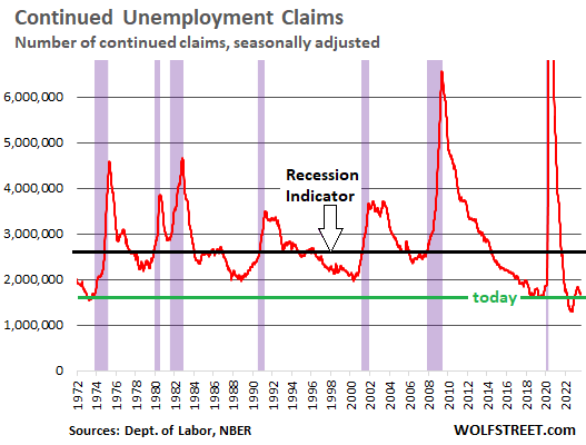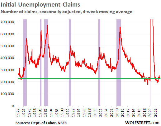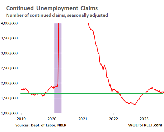 We’ve been on a recession watch here ever since the Fed started hiking rates. Sharp increases in weekly claims for unemployment insurance benefits – especially “continued claims” – are highly correlated with recessions. So we keep an eye on it from time to time. The data did show some weakening from September 2022 into early 2023, but remained in the range of the Good Times lows, and in recent months, the signals backtracked, as unemployment claims fell. The expectations of a recession this year have been cancelled months ago, and by now, there’s no recession in sight. Maybe next year, maybe whenever.