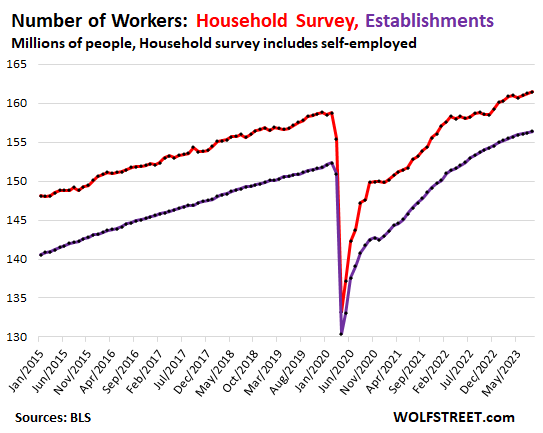 The long-term view shows that the labor market, as depicted by people continuing to claim unemployment benefits, has strengthened since April, after having weakened a little in late 2022 and early 2023. But throughout this period, it has remained historically tight, and even at the worst point earlier this year, it was in the range of the Good Times just before the pandemic, and much tighter than in the prior 50 years.