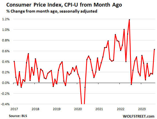 The Consumer Price Index (CPI) jumped by 0.63% in August from July, the biggest month-to-month increase since June 2022. Annualized, this amounts to a red-hot 7.8%.