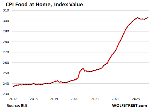 Food prices at grocery stores and markets have calmed down at astronomical levels, following the 24% spike during the pandemic. Instead of plunging to bring them back into line, food prices dipped just a little for a few months and now started rising again at roughly the pace before the pandemic, but on top of these nosebleed levels!