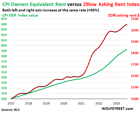 The chart shows the OER (green, left scale) as index values, not percent change; and the ZORI (red, right scale). The left and right axes are set so that they increase each by 50%, with the ZORI up by 47.3% since the beginning of 2017 and the OER up by 30.5%: