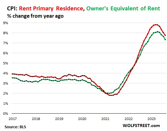 Owners’ equivalent rent: +0.38% for August, +7.3% year-over-year (green). This is based on what a large group of homeowners estimates their home would rent for.
