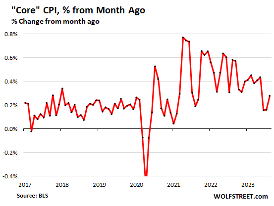 Core CPI, month-to-month, was held down by the collapse of the health insurance CPI, and yet, it still accelerated to 0.28% in August from July.