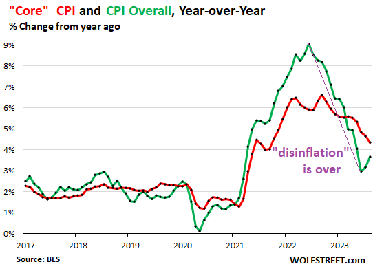 With this month-to-month spike, the year-over-year CPI rate accelerated to 3.7%, the second year-over-year acceleration since June 2022, according to the Bureau of Labor Statistics today (green in the chart below). July had already marked the end of the period of “disinflation” when the year-over-year inflation rate accelerated for the first time since June 2022.