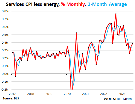 The index for core services (without energy services) accelerated to 0.39% in August from July, the second month in a row of acceleration, despite the adjustment to the CPI for health insurance of -3.6% in August from July.