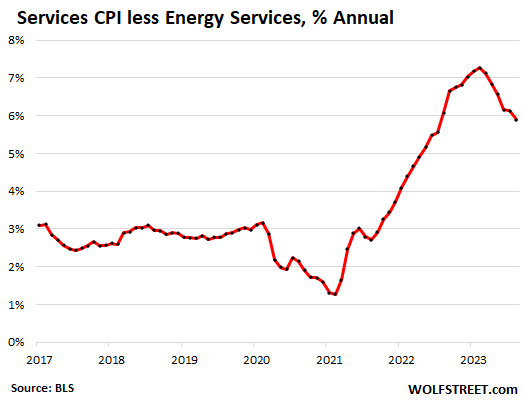 Year-over-year, the core services CPI rose by a still red-hot 5.9%, despite the 33.6% collapse of the health insurance CPI within it.