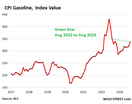 But on a month-to-month basis, gasoline prices have been surging all year – they jumped 10.6% in August from July – thereby whittling away at the year-over-year plunge as we went. In August, gasoline CPI was still down by 3.3% from August 2022.