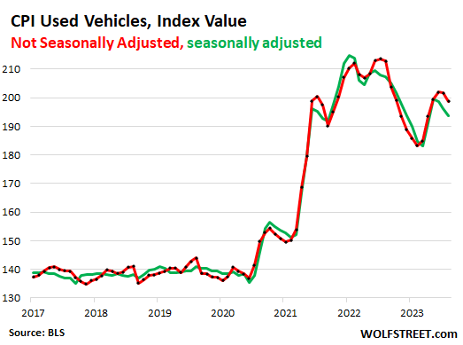 Used vehicle CPI has gone through some major gyrations after the historic 53% spike in used vehicle prices that started in 2020 and peaked at the end of 2021. In August, the used vehicle CPI fell by 1.2% seasonally adjusted from July and was down by 6.6% from a year ago. From the peak, it has now fallen by 10%.