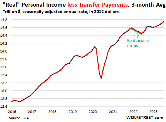 We’ve long expected that consumers would shift their spending from goods that retailers sell, after the drunken binge during the pandemic, to services that retailers don’t sell, and they did.