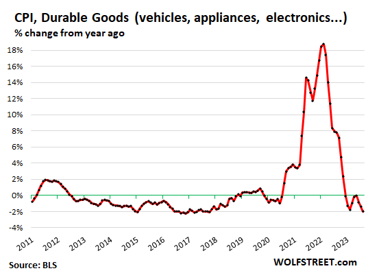 The CPI for durable goods — which dominated by new and used vehicles, furniture, equipment, electronics, etc. — fell by 0.3% in August from July, and fell by 2.0% year-over-year: