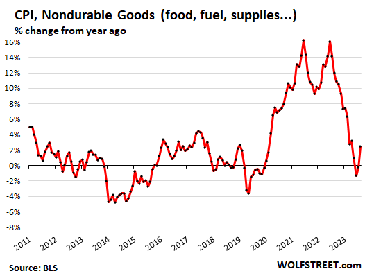 The CPI for nondurable goods — dominated by gasoline, food, clothing, and supplies — jumped by 1.8% in August from July, and was 2.5% year-over-year: