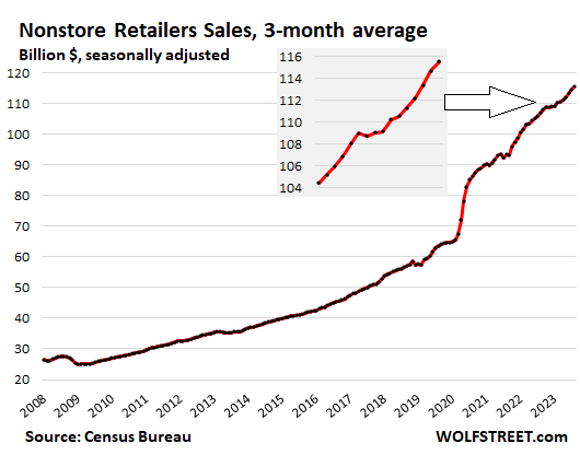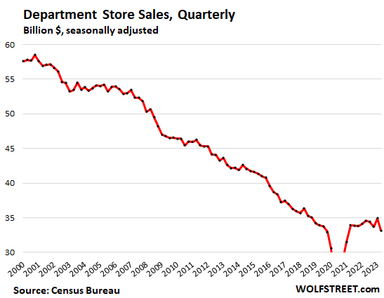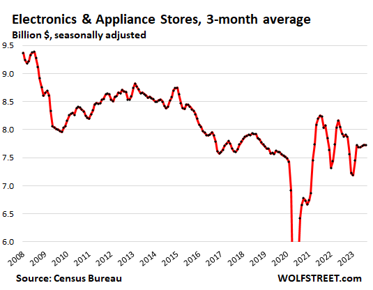Other categories of brick-and-mortar retailers, such as department stores and electronics and appliance stores, have been getting wiped out systematically by ecommerce, as you can see in the charts below, and I have reported on their countless bankruptcies, liquidations, and store closings since 2016 under the leitmotif of Brick-and-Mortar Meltdown.