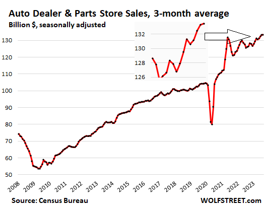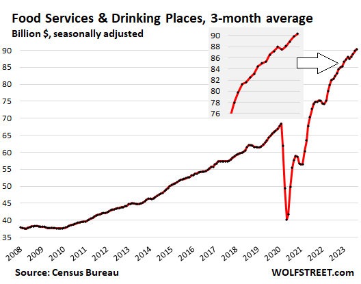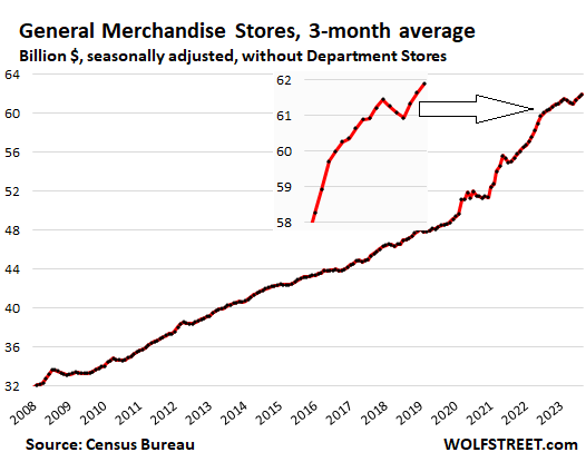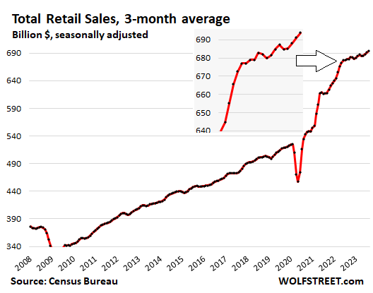 Total retail sales, including at food services and drinking places, jumped 0.6% in August from July, after the 0.5% jump in June. Compared to a year ago, retail sales rose 2.5%, seasonally adjusted. Not seasonally adjusted, retail sales rose 2.9% year-over-year to $719 billion. The chart shows the three-month moving average to tamp down on the artificial drama of the monthly ups and downs that can obscure the trends.