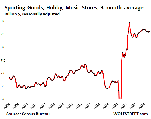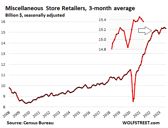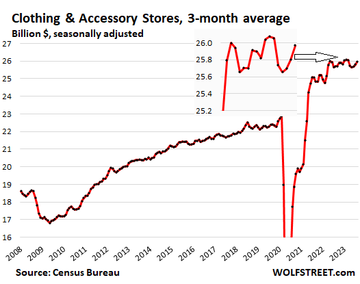 Retailers sell mostly goods, and many goods prices, after spiking in 2020 and 2021, have flattened out or dropped from the peaks, including the biggie, motor vehicles. When holding retail sales against inflation, you cannot hold it against the overall CPI, which is dominated by services, which retailers don’t sell, and in services is where inflation is now raging. You have to compare the goods retailers sell to the CPIs for those goods.