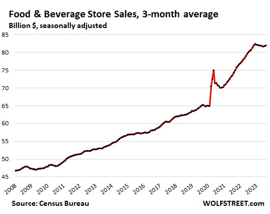 Food and Beverage Stores (12% of total retail). Sales leveled off in prior months as food prices, after spiking, dipped. Now food prices are ticking up again: